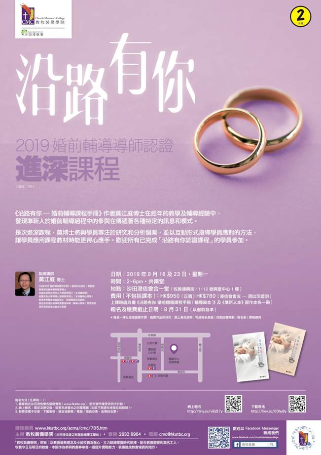 CMC證書課程(編號705): 「沿路有你」婚前輔導導師進深課程 日期:2019年9月16、23日.周一 | 時間:下午2時 至 6時.共兩節 地點:沙田浸信會合一堂(佐敦德興街11~12號興富中心 1 樓)à地圖ß 訓練講師: 莫江庭 博士 《沿路有你 ~ 婚前輔導課程手冊》(基稻田出版社) 原創者 現任愛群道浸信會主任牧師 報名方法 (任擇其一): (1) 親身前往沙田浸信會各個聚會點(www.hkstbc.org ),部份堂所接受信用卡付款。 (2) 網上報名:填妥並提交後,留意系統發出之回覆電郵(如收不到請先檢查垃圾郵箱)。 (3) 郵寄或電子交表:下載表格,填妥郵寄/電郵/傳真交表,並寄回支票。