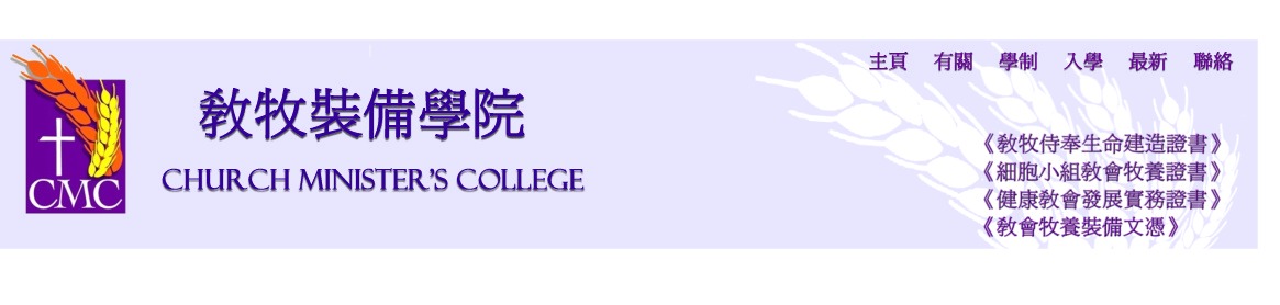 「教牧裝備學院」宗旨:以教會增長理念及小組牧養為重心,主力訓練掌握時代脈搏、配合教會需要的當代工人,牧養今日及明日的教會。本院作為參與教會侍奉者一個提升實戰能力、裝備達成教會增長的地方。 |