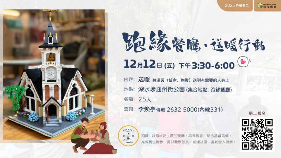 日期:12月12日(五) 時間:下午3:30-6:00 地點:跑緣餐廳(深水埗) 報名:請掃瞄QR Code報名 查詢:李煥亭傳道 26325000(內線331) |