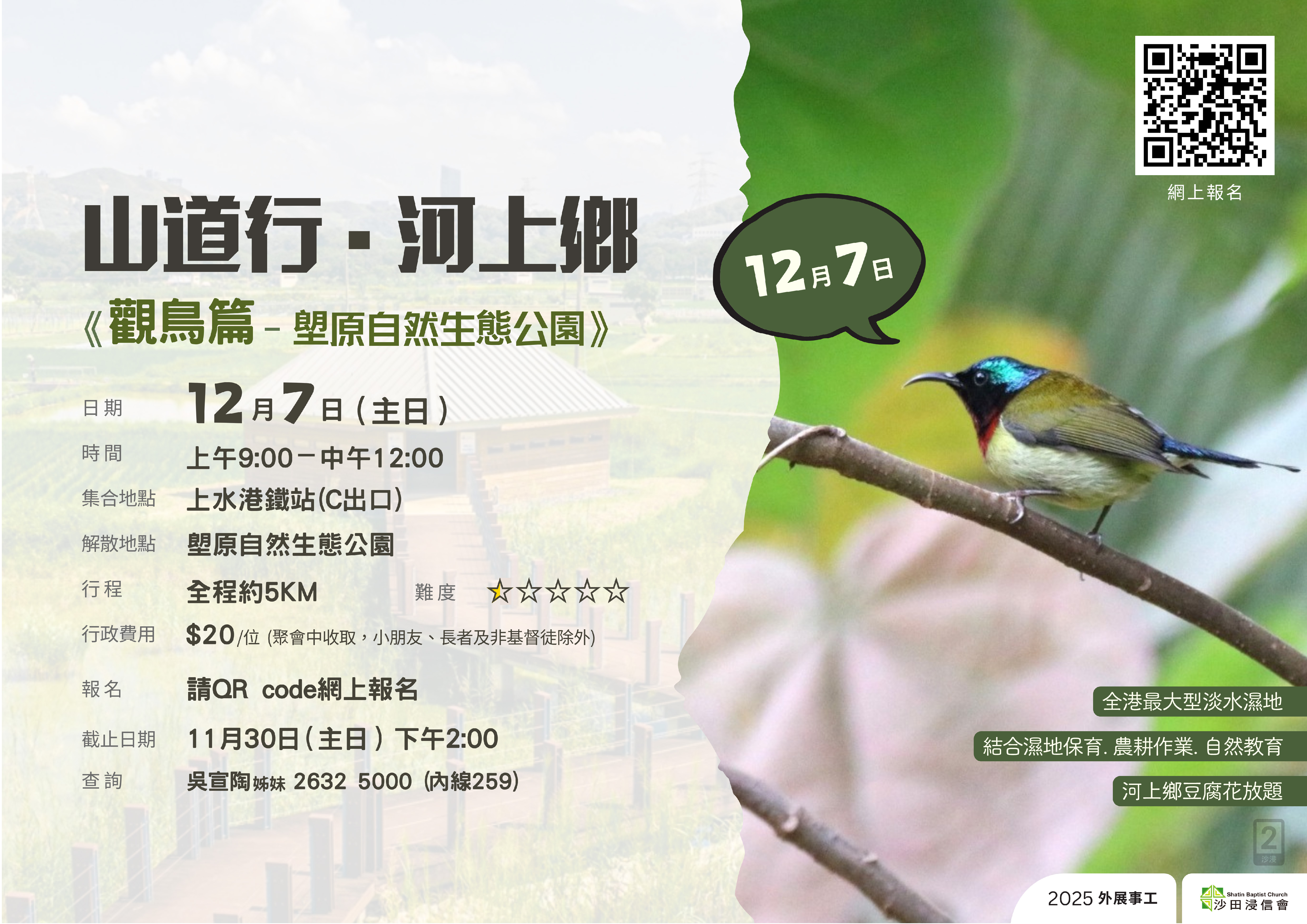 12月山道行 - 河上鄉 日期:12月7日(日) 時間:上午9:00-中午12:00 行程:約5km,難度:0.5星 報名:請掃瞄QR Code報名 截止:30/11(日) 查詢:吳宣陶姊妹26325000(內線259) |